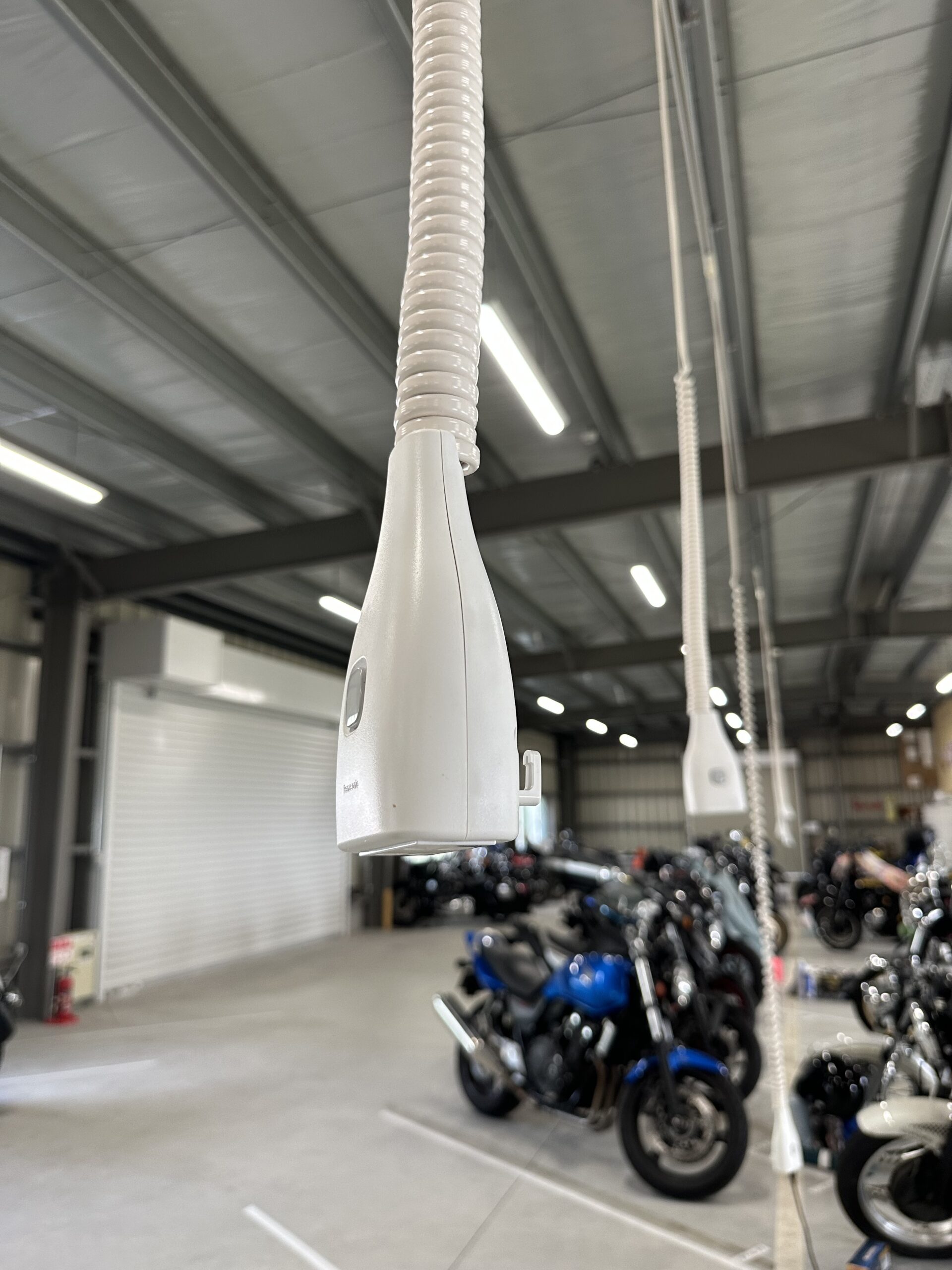 駐車場の天井から吊り下げ式となっており、どこに駐車しても使用できるようになっています。